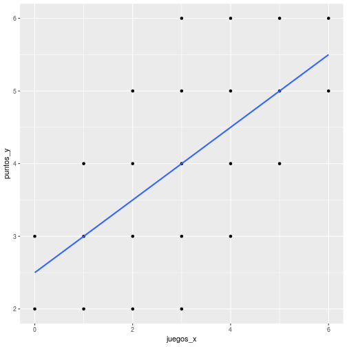 ] ] --- # Descriptivos ```r stargazer(datos, type = "html") ``` <table style="text-align:center"><tr><td colspan="8" style="border-bottom: 1px solid black"></td></tr><tr><td style="text-align:left">Statistic</td><td>N</td><td>Mean</td><td>St. Dev.</td><td>Min</td><td>Pctl(25)</td><td>Pctl(75)</td><td>Max</td></tr> <tr><td colspan="8" style="border-bottom: 1px solid black"></td></tr><tr><td style="text-align:left">id</td><td>23</td><td>12.000</td><td>6.782</td><td>1</td><td>6.5</td><td>17.5</td><td>23</td></tr> <tr><td style="text-align:left">juegos_x</td><td>23</td><td>3.000</td><td>1.758</td><td>0</td><td>2</td><td>4</td><td>6</td></tr> <tr><td style="text-align:left">puntos_y</td><td>23</td><td>4.000</td><td>1.382</td><td>2</td><td>3</td><td>5</td><td>6</td></tr> <tr><td colspan="8" style="border-bottom: 1px solid black"></td></tr></table> --- .left-column[ # **Medias condicionales** ] .center[] ??? Ejemplo para los sujetos con 1 en X hay 3 valores de Y: 2, 3 y 4. Por lo tanto, la media condicional de Y dado X=1 es 3 --- .left-column[ # Idea de distribución condicional ] .center[] --- .left-column[ # La recta de regresión ] .right-column[ .center[] .small[ La (co) variación general de Y respecto a X se puede expresar en una ecuación de la recta = **modelo de regresión** ] ] --- class: inverse, right ## Para obtener la “mejor recta” se utiliza la estimación de mínimos cuadrados (EMC, o **OLS** – Ordinary Least Squares) -- ## OLS minimiza la suma de los **residuos** = distancias entre las observaciones y la recta en el eje vertical --- # Componentes de la ecuación de la recta de regresión `$$\widehat{Y}=b_{0} +b_{1}X$$` Donde - `\(\widehat{Y}\)` es el valor estimado de `\(Y\)` - `\(b_{0}\)` es el intercepto de la recta (el valor de Y cuando X es 0) - `\(b_{1}\)` es el coeficiente de regresión, que nos dice cuánto aumenta Y por cada punto que aumenta X --- # Estimación de los coeficientes de la ecuación: `$$b_{1}=\frac{Cov(XY)}{VarX}$$` `$$b_{1}=\frac{\frac{\sum_{i=1}^{n}(x_i - \bar{x})(y_i - \bar{y})} {n-1}}{\frac{\sum_{i=1}^{n}(x_i - \bar{x})(x_i - \bar{x})} {n-1}}$$` Y simplificando `$$b_{1}=\frac{\sum_{i=1}^{n}(x_i - \bar{x})(y_i - \bar{y})} {\sum_{i=1}^{n}(x_i - \bar{x})(x_i - \bar{x})}$$` --- # Estimación de los coeficientes de la ecuación: Luego despejando el valor de `\(b_{0}\)` `$$b_{0}=\bar{Y}-b_{1}\bar{X}$$` --- # Cálculo de coeficientes La base para todos estos calculos es la diferencia de cada valor menos su promedio. Para ello: 1. Vamos a crear los siguientes vectores (variables) en nuestra base de datos `$$difx=x-\bar{x}$$` `$$dify=y-\bar{y}$$` --- # Cálculo basado en el ejemplo 2.Con la información anterior podemos obtener la diferencia de productos cruzados `$$difcru=(x-\bar{x})*(y-\bar{y})$$` 3.También obtenemos las diferencias del promedio al cuadrado de X= `$$difx2=(x-\bar{x})^2$$` --- class: split-40 count: false .column[.content[ ```r *datos_b <-datos datos_b ``` ]] .column[.content[ ``` ## id juegos_x puntos_y ## 1 1 0 2 ## 2 2 0 3 ## 3 3 1 2 ## 4 4 1 3 ## 5 5 1 4 ## 6 6 2 2 ## 7 7 2 3 ## 8 8 2 4 ## 9 9 2 5 ## 10 10 3 2 ## 11 11 3 3 ## 12 12 3 4 ## 13 13 3 5 ## 14 14 3 6 ## 15 15 4 3 ## 16 16 4 4 ## 17 17 4 5 ## 18 18 4 6 ## 19 19 5 4 ## 20 20 5 5 ## 21 21 5 6 ## 22 22 6 5 ## 23 23 6 6 ``` ]] --- class: split-40 count: false .column[.content[ ```r datos_b <-datos *datos$p_x <- mean(datos$juegos_x) datos_b ``` ]] .column[.content[ ``` ## id juegos_x puntos_y ## 1 1 0 2 ## 2 2 0 3 ## 3 3 1 2 ## 4 4 1 3 ## 5 5 1 4 ## 6 6 2 2 ## 7 7 2 3 ## 8 8 2 4 ## 9 9 2 5 ## 10 10 3 2 ## 11 11 3 3 ## 12 12 3 4 ## 13 13 3 5 ## 14 14 3 6 ## 15 15 4 3 ## 16 16 4 4 ## 17 17 4 5 ## 18 18 4 6 ## 19 19 5 4 ## 20 20 5 5 ## 21 21 5 6 ## 22 22 6 5 ## 23 23 6 6 ``` ]] --- class: split-40 count: false .column[.content[ ```r datos_b <-datos datos$p_x <- mean(datos$juegos_x) *datos$difx <-datos$juegos_x-datos$p_x datos_b ``` ]] .column[.content[ ``` ## id juegos_x puntos_y p_x ## 1 1 0 2 3 ## 2 2 0 3 3 ## 3 3 1 2 3 ## 4 4 1 3 3 ## 5 5 1 4 3 ## 6 6 2 2 3 ## 7 7 2 3 3 ## 8 8 2 4 3 ## 9 9 2 5 3 ## 10 10 3 2 3 ## 11 11 3 3 3 ## 12 12 3 4 3 ## 13 13 3 5 3 ## 14 14 3 6 3 ## 15 15 4 3 3 ## 16 16 4 4 3 ## 17 17 4 5 3 ## 18 18 4 6 3 ## 19 19 5 4 3 ## 20 20 5 5 3 ## 21 21 5 6 3 ## 22 22 6 5 3 ## 23 23 6 6 3 ``` ]] --- class: split-40 count: false .column[.content[ ```r datos_b <-datos datos$p_x <- mean(datos$juegos_x) datos$difx <-datos$juegos_x-datos$p_x *datos$p_y <- mean(datos$puntos_y) datos_b ``` ]] .column[.content[ ``` ## id juegos_x puntos_y p_x difx ## 1 1 0 2 3 -3 ## 2 2 0 3 3 -3 ## 3 3 1 2 3 -2 ## 4 4 1 3 3 -2 ## 5 5 1 4 3 -2 ## 6 6 2 2 3 -1 ## 7 7 2 3 3 -1 ## 8 8 2 4 3 -1 ## 9 9 2 5 3 -1 ## 10 10 3 2 3 0 ## 11 11 3 3 3 0 ## 12 12 3 4 3 0 ## 13 13 3 5 3 0 ## 14 14 3 6 3 0 ## 15 15 4 3 3 1 ## 16 16 4 4 3 1 ## 17 17 4 5 3 1 ## 18 18 4 6 3 1 ## 19 19 5 4 3 2 ## 20 20 5 5 3 2 ## 21 21 5 6 3 2 ## 22 22 6 5 3 3 ## 23 23 6 6 3 3 ``` ]] --- class: split-40 count: false .column[.content[ ```r datos_b <-datos datos$p_x <- mean(datos$juegos_x) datos$difx <-datos$juegos_x-datos$p_x datos$p_y <- mean(datos$puntos_y) *datos$dify <-datos$puntos_y-datos$p_y datos_b ``` ]] .column[.content[ ``` ## id juegos_x puntos_y p_x difx p_y ## 1 1 0 2 3 -3 4 ## 2 2 0 3 3 -3 4 ## 3 3 1 2 3 -2 4 ## 4 4 1 3 3 -2 4 ## 5 5 1 4 3 -2 4 ## 6 6 2 2 3 -1 4 ## 7 7 2 3 3 -1 4 ## 8 8 2 4 3 -1 4 ## 9 9 2 5 3 -1 4 ## 10 10 3 2 3 0 4 ## 11 11 3 3 3 0 4 ## 12 12 3 4 3 0 4 ## 13 13 3 5 3 0 4 ## 14 14 3 6 3 0 4 ## 15 15 4 3 3 1 4 ## 16 16 4 4 3 1 4 ## 17 17 4 5 3 1 4 ## 18 18 4 6 3 1 4 ## 19 19 5 4 3 2 4 ## 20 20 5 5 3 2 4 ## 21 21 5 6 3 2 4 ## 22 22 6 5 3 3 4 ## 23 23 6 6 3 3 4 ``` ]] --- class: split-40 count: false .column[.content[ ```r datos_b <-datos datos$p_x <- mean(datos$juegos_x) datos$difx <-datos$juegos_x-datos$p_x datos$p_y <- mean(datos$puntos_y) datos$dify <-datos$puntos_y-datos$p_y *datos$dif_cru <-datos$difx*datos$dify datos_b ``` ]] .column[.content[ ``` ## id juegos_x puntos_y p_x difx p_y dify ## 